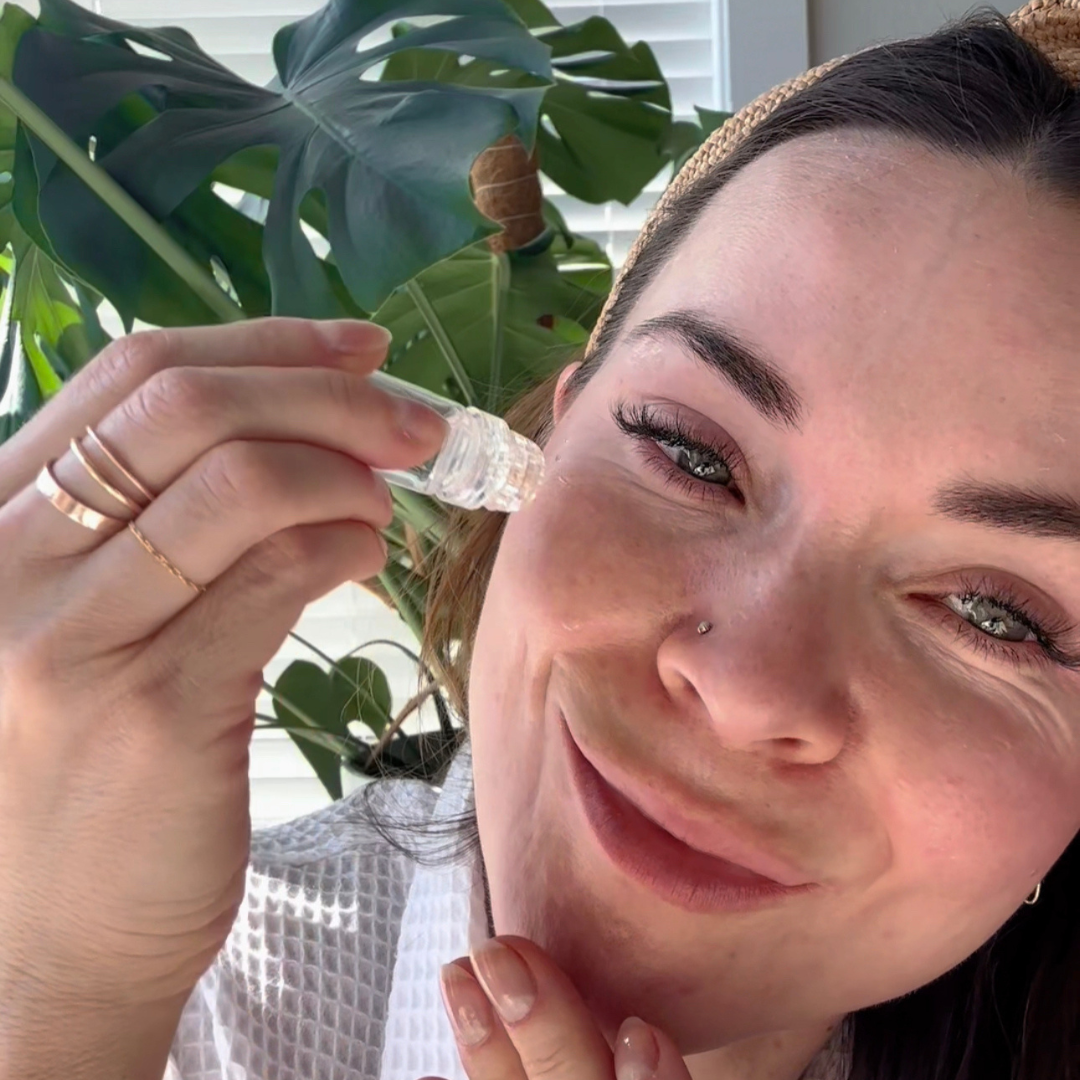 Étape 4: Massez l’excédent de sérum sur votre peau et laissez-le agir toute la nuit. Pour une routine complète, appliquez ensuite vos soins habituels.