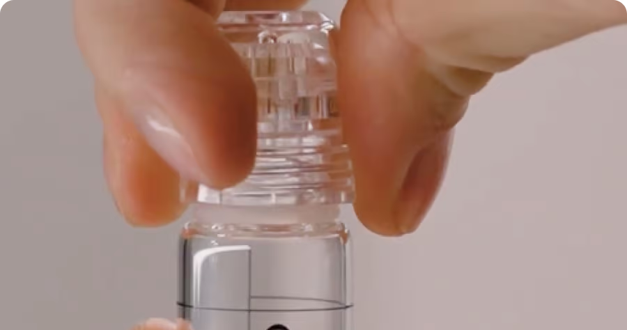 Tournez doucement la tête à micro-aiguilles pour l’ouvrir. Remplissez la chambre du dispositif avec une ampoule entière de sérum. Refermez sans forcer pour une application optimale. Il est important de refermer la tête à aiguille sans trop la serrer : plus elle est serrée, plus le liquide aura du mal à s'écouler.